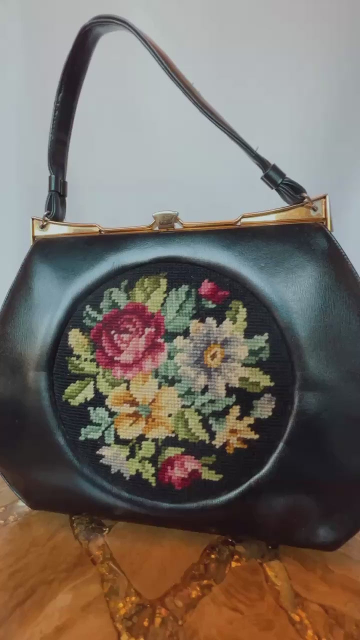 Stunning 1950s Vintage Floral Embroidered Handbag – Black with Vibrant Floral Design